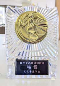 🎉文化書道学会学童全国書き初め競技会にて、小学三年生(4月から四年生)のМちゃんが特賞をいただき、楯を賜りました‼